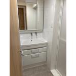 リフォーム後はタイル張りの壁や床から、すっきりとしたホワイトを基調とした内装に変更され、圧迫感のあった空間が広々と感じられるようになっています。 新しい洗面化粧台は、鏡裏に収納スペースが備わった三面鏡タイプで、下部にも引き出し収納が設けられており、洗剤やタオルなどを効率的に整理できます。