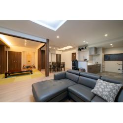 ご家族の個室を設けながらLDKは広く、収納も多くというご要望を叶えるため、さまざまなプランを検討しています。1階の畳コーナーは勾配天井をフラットにすると段差ができるため、間接照明を加えて高級感をアップしました。お父さまのこだわりを随所に実現することができ、三世代で楽しく過ごしておられるとお聞きしてうれしく存じます。