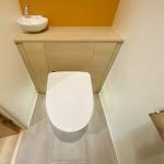 便器はフロートタイプとなり、下部が間接照明でやわらかく照らされています。背面収納は落ち着いた木目調の色合いで、オレンジのアクセントクロスと調和。円型の手洗い器は中央からやや左寄せに配置され、デザイン性と使いやすさを両立した空間に仕上がっています。