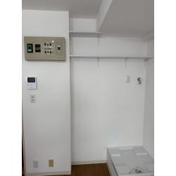 新たに洗濯機置場を設置するにあたり、排水などに問題がないか調査、設置に伴う大工工事、設備工事を させていただきました。 壁紙・巾木も新しくなり、清潔感のある空間となりました。 収納に困らないよう壁付け棚を作らせていただきました。