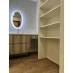 施工後の洗面室 タカラスタンダードのエリーナをご採用。背面にオープン収納を造作したので使いたいものが一目で分かり、取り出しやすくなりました。