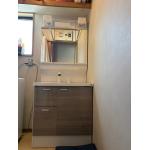 予算内に収まる洗面台をご用意いたしました。 収納も背の高い洗剤をストックしたいとのことでしたので半分は引き出し、半分は開き扉タイプを採用