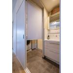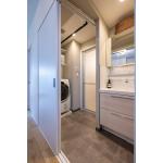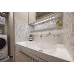 水まわりはコンパクトにまとめました。脱衣室は扉ではなくロールスクリーンで間仕切り、省スペース&プライバシーに配慮しました。洗面台は奥行がスリムな機器をチョイスし、動線上の通路幅を確保しました。また、お施主様ご要望であるタイルは洗面まわりに貼り、明るく清潔感のある空間になりました。