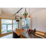 ダイニングテーブルはキッチンと横並びに配置し、配膳しやすい動線に。施主様がイメージしていた、開放的で広々としたLDKが実現しました。 天井にはダクトレールを設置し、照明器具の取り付け位置を自由に変更可能に。観葉植物を飾るなどのアレンジも楽しめます。 窓には無垢の木で作られたウッドワンのMOKUサッシを採用。 断熱性向上が期待できるだけでなく、インテリアとの調和も魅力です。 さらに、リビングの一角にはワークスペースも新設しました。