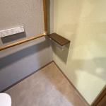 壁補強をして手すりをもとの位置に再設置いたしました。天然木の棚付二連紙巻器は、立ち座りの際に体を支える棚としても機能します。