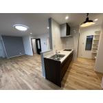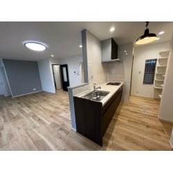 LDK空間を繋げ、お施主様お好みのカラーで対面キッチンをセットしました。キッチン前の壁を広めに取り、リビング側への油ハネ対策としました。