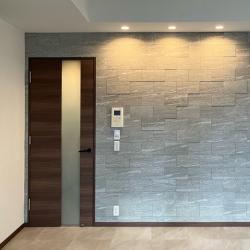 夜に照明により際立つ高級感が増すエコカラット素材は日中も適度な素材アクセントになり、リビング空間をおしゃれに演出いたしました。