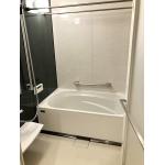 システムバスルームは空間にゆとりがある1418サイズ。浴槽は傷に強く、汚れが落としやすいアクリル人造大理石の「キープクリーン浴槽」で、光沢が美しいクリスタルパールホワイトに。高級ホテルのような磁器タイルで優雅さもありながら、ほっとできる浴室になりました。