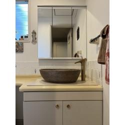 カウンターを残したいとのご依頼を頂き、既存のカウンターに人造大理石のプレートを設置し、その上にお客様でご購入いただいた置き型ボールを設置し水栓も交換致しました。