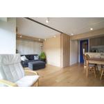 施主様のイメージ通り、天井埋め込み式レールに収納できる「3枚引戸」を設置し、空間を完全にオープンにできるようにしました。さらに、全部屋の床材には、明るく上品な色合いと丈夫で硬い質感が魅力のメープル無垢材を採用しました。