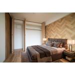 ベッドヘッド面の壁に大胆にあしらったヘリンボーンクロス。見る角度によって表情を変える美しい木目が、空間に奥行きとリズミカルな動きを生み出します。