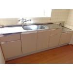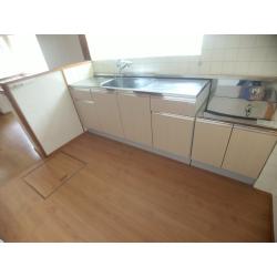 同じタイプの組合せタイプのキッチンで交換いたしました。 床は既存のクッションフロアを剥がし、上張り用フローリングを施工させていただきました。