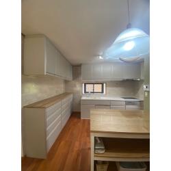 まるで料理教室のような素敵なキッチンです。 収納するものが無くなりそうなくらい十分な収納棚は家電もズラリと綺麗に並べられます。