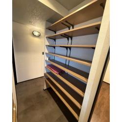 玄関横を大きく広げ、大容量のシューズクロークと収納スペースを確保しました。シューズクロークは可動棚とし、様々なタイプの靴が収納できるよう仕上げました。