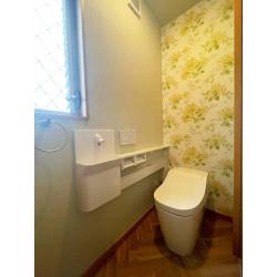 トイレに不具合がでたため、リフォームをしました。 タンク手洗いの使いにくさを感じていたため、すっきりとした見た目で手洗いカウンターの寸法がコンパクトなPanasonicのアラウーノを選定。 スムーズな動線が確保されました。 ヘリンボーン柄の床をご提案し、アクセントクロスに負けない存在感で既存との雰囲気がガラッと変わりました。 かわいらしいトイレ空間に大変お喜びいただきました。