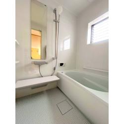 在来風呂からのリフォームです。 最新の設備になり、機能性や保温性が上がりました。 ほっカラリ床は内側の断熱クッション層で、畳のようなやわらかさと同時に室温とほぼ同じあたたかさを実現。さらに床面に刻まれたパターンが表面の水を誘導し、乾きが早く、一歩目がカラッと快適に! 浴槽とふろふたも断熱仕様なので、温かさが長続きします。