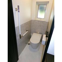 トイレ本体をタンクレスタイプに変更し、給水管や水抜き栓も交換してすっきりとしました。 手洗いはトイレ向かいの収納スペースを改修して、新たに洗面スペースを設けております。 床と腰高の壁にはホーロー素材のパネルを貼り、汚れが付きにくく、お掃除のしやすい空間に生まれ変わりました。