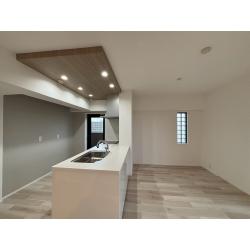 開放感のあるLDKに、使い勝手の良いアイランドキッチンを採用。各部屋にはたっぷりの収納を設け、生活動線もすっきり。リビングには壁掛けテレビ用の収納などこだわりが詰まっています。 ナチュラルな中にも洗練された雰囲気色合いの床と照明が心地よく、居心地のよい住まいへ。