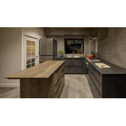 設計・施工では、L型キッチンと勝手口の取り合いを現場で調整し、大判タイルや漆喰壁、天井の納まりにも工夫を凝らしました。キッチンカウンター側は昼白色、部屋全体は電球色の照明で、濃いグレーのタイルでも手元が暗くならないよう配慮しました。床はモルタル調フロアタイルで清掃性も向上。お施主さまからは、シンクとコンロの距離が近く作業しやすく、アイランド作業台も便利で、収納も使いやすくなり、理想の美しいキッチンに大満足との声をいただきました。