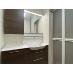 設備の老朽化が気になり、内装のリフォームを含めて 考えていました。浴室の入口枠にぶつからない奥行の 化粧台という希望がありました。