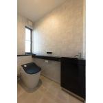 優しい色味のダマスク&フラワーの壁紙が落ち着くトイレ空間