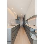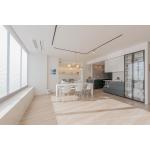 空気・温熱環境に配慮してプランニングしました。窓には内窓を取り付け、断熱性を向上。壁・天井は天然素材の漆喰にしています。オーダーキッチンの天板は汚れ、傷、そして熱に対する高い耐性を持つデクトンを使い、使い勝手に配慮しました。TVの後ろの壁は同じ色で質感の異なるタイルでポイントを演出。窓のカウンターや窓下にも大理石調のタイルを使ったりと、高級感の有るホワイトインテリアにまとめています。床には床暖房を設置。手入れのしやすいライトオークのフローリングを使い、木目のナチュラルな印象を加えました。