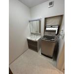 洗面化粧台の入替と天井・壁のクロスと床のクッションフロアも張替えました。 また洗濯機が壁の給水栓と干渉し、洗濯物の出し入れがしづらい向きになっていた為、洗濯パンの位置を移設し使いやすくなりました。