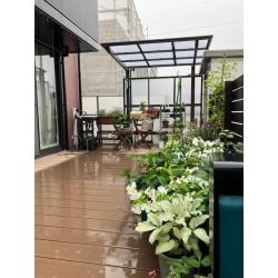 既存の植栽も活かしつつ古くなったフェンスとデッキを新しくし、テラスも設置しました。すっきりとして、植栽が映える空間になりました。