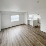 リフォーム後の同じ画角の写真です。キッチンの窓とリビングの窓から自然光が入り、明るく開放的な空間となっています。壁で区切られていた以前のレイアウトから一体化され、キッチンからリビングまでの視線が広がり、暮らしやすさと快適さが大幅に向上しました。