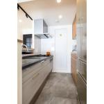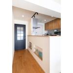 調理中にご家族との会話やテレビを楽しめるよう、キッチンのレイアウトの変更をプラン。デッドスペースはニッチ収納などをプランし、収納スペースを確保。キッチン、洗面脱衣室との間にドアを設け、家事動線の効率化を図りました。