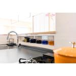 収納力と作業スペースの両方にゆとりが生まれ、使い勝手が大きく向上しました。また、垂れ壁を撤去しキッチンの向きを変更したことで調理中にご家族との会話やテレビを楽しめるようになりました。さらにキッチンと洗面脱衣室の間仕切り壁に出入口を設け、キッチン、洗面脱衣室の家事動線がスムーズに。ゆとりのある開放的なキッチン空間へ生まれ変わり、お喜びいただくことができました。