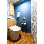 トイレは収納一体型タイプのレストパルを採用。お掃除がしやすく、限られたスペースを有効活用できる点がポイントです。壁には埋め込み型の扉付き収納棚を設けました。空間の雰囲気を損なわず、スッキリとした印象に。さらに、2面にアクセントクロスを施工し、爽やかで明るい空間が完成しました。