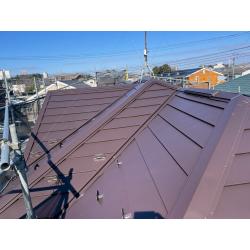 屋根の見た目の劣化や耐久性への不安からご相談いただきました。 採用した「横暖ルーフαプレミアムS」は、色褪せしにくく耐久性に優れた金属屋根です。 落ち着いた赤みのある上品な仕上がりとなり、これからも長く安心して暮らしていただけるリフォームとなりました。