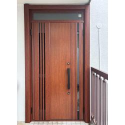 木製ドアからの交換のため、違和感がないよう木目調のデザインで、大きな荷物の搬出入がしやすい親子ドアをご提案。また、夏場に風通しがよくなるよう採風タイプに。デザインと機能面、ともに大変気に入っていただきました。 (101 16462)