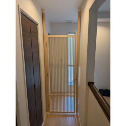 階段部分に猫が脱走しないように、にゃんがーどの扉を設置しました。 木製の扉は和洋問わずインテリアに調和します。突っ張り型なので壁・床・柱を傷つけず賃貸住まいでも安心して設置することができます。耐久性があり水にも強く無垢材使用のため舐めても安全です。