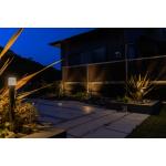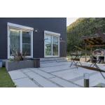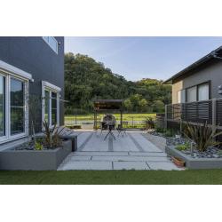 雑草対策が主なご相談内容でしたが、既に設置されているピザ窯を活かして、ロックガーデン風のお庭をご提案しました。建物の雰囲気に調和するモノトーンの構造物に、天然木のサイドテーブルを組み合わせ、リビング空間の延長としてくつろげるスペースになるよう工夫しました。また、広々としたロケーションで周囲の美しい景色も楽しめる点が魅力です。花壇にはグレーカラーのジョリパットを使用し、床面はコンクリート土間やモノトーンのタイルテラスで仕上げました。雑草対策としては、防草シートと栗石を敷き、シンボリックに見えるよう植物を配置しています。さらに、夜間にはセンサー式の照明が自動点灯し、昼間とは異なる落ち着いた空間を演出しています。
