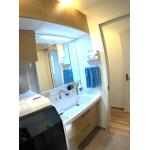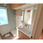 引き出しキャビネット+吊戸棚で収納力をアップしました。 木目調の温かみのある洗面台を選定されました。 お掃除しやすい幅広の洗面ボールはお洗濯の余洗いにも便利です。
