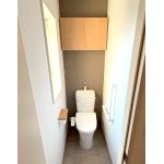 2Fは手洗い付きのトイレを提案。 吊戸棚を取り付け、収納を確保しました。