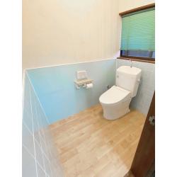 小便器と手洗器を撤去。 残った給排水管の穴は、パネルで塞ぎました。 パネルは既存の内装に合うよう、爽やかな水色を採用しました。 小便器を撤去したことにより空間が広くなったため、大便器の取付位置も変更しゆとりをもって使えるようになりました。 床はご要望通り、タイルからクッションフロアに変更しました。 床に傾斜がついていたため、角材と合板で下地を組み、その上からクッションフロアを施工しました。 トイレの床高が上がり洗面室との段差も解消されたおかげで、つまずく心配もなくなりました。