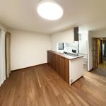 ダイニングと旧和室を一体化し、広々としたリビング・ダイニング空間へと変更しました。 キッチンは壁の一部を撤去し、対面式をベースとした開放的な配置としています。 カウンター側には吊戸棚を設け、収納力を確保。 また、リビング側にはカウンター下収納を新設し、使い勝手と収納量の向上を図りました。