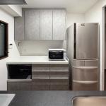 作業スペースと調理スペースの配置を入れ替え、対面式キッチンに。クイックパレット付き吊戸棚を設け、使いやすい収納力を確保しました。ラパートカーボン色のワークトップと、グレージュスタッコ色の扉が調和した、上質で開放的なキッチン空間に仕上がりました。