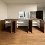 現在のキッチン・リビング・ダイニングはそれぞれ仕切られており、閉鎖的に感じているので、壁を取り払って空間を一体化し、明るく開放的な空間にしたいと考えています。 キッチンは、対面式にして、レンジフード側に、折りたたみ棚(クイックパレット)が格納された吊戸棚を設置できるか検討してください。 デザインだけでなく、使い勝手や動線にも配慮した、日々の家事がしやすい便利で使いやすいキッチンへの交換を希望しています。