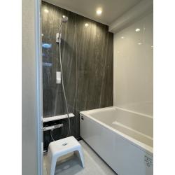 今回のリフォームでは、老朽化やタイル目地の汚れによるお手入れ負担を解消するため、タカラスタンダードのシステムバス「グランスパ」1216サイズへ交換しました。浴槽は出入りしやすいセミスクエア形状と高断熱浴槽を採用し、快適さと保温性に配慮しています。 壁には高品位ホーローの浴室パネルを使用し、汚れが付きにくく清潔を保ちやすい仕様に。浴室正面の壁にはシオマーブルモスグレーのアクセントパネルを採用し、空間に上質な落ち着きと奥行きをプラスしました。 床はキープフロア(ハイクラス)で、傷つきにくく掃除のしやすさも向上。カウンターや浴槽エプロン、天井・照明・ドアはホワイトで統一し、明るくすっきりとした印象に仕上げています。マグネット対応のどこでもラックやシャワーフックも取り入れ、素材・機能・使い勝手にこだわった快適な浴室空間となりました。