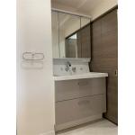洗面台には LIXIL ピアラ を採用し、 引出し式の収納を採用することで、洗面用品の出し入れがしやすく、見た目もすっきりと整理できます。 三面鏡の LED照明 により、顔まわりを均一に照らし、明るく使いやすい洗面室となっています。