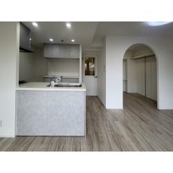 洋室の入り口をLDK側へ変更し、家族の気配を感じられる動線へ刷新しました 。広さを3.5畳へ拡張し、布団を敷いて寝室としても活用できる実用性を確保しています。入り口に設けたアーチ開口は、開放感を保ちつつ空間のアクセントとなるモダンな仕上がりとなっています。キッチンは吊戸棚を撤去して視線を繋げ、幅を2250mmへ広げたことで、家族で並んで立てるゆとりある調理空間と、明るく広々としたLDKを実現しました。