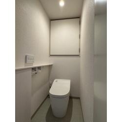 経年劣化によるお手入れ負担を軽減するため、汚れが付きにくく掃除しやすいパナソニックのアラウーノL150T2をご提案しました。泡と水流で自動洗浄する機能により、日常のお掃除をラクにし、清潔な状態を保ちやすくなります。内装はモダンテイストを意識し、落ち着きのある色合いで統一。さらに手前の壁には半埋込タイプのカウンター付き収納を採用し、出っ張りを抑えつつ、小物を使いやすく収納できる空間構成としました。