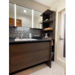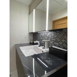 ラピシアブラックのカウンターと三面鏡の間には、LIXILのメタガラスを施工、光の反射で空間に奥行きと高級感をプラスしました。一体成形のスクエアボウルと深みのあるカウンターが美しくつながり、つなぎ目がないため汚れがたまりにくくお手入れも簡単です。素材の質感と照明効果が調和し、ホテルライクな洗面空間を演出。