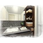 ホテルのサニタリーのような上質感をテーマに、洗面空間全体をトータルでご提案しました。洗面化粧台にはLIXIL「ルミシス」ボウル一体タイプを採用し、つなぎ目のないカウンターで美しさとお手入れのしやすさを両立しています。フルスライド収納や三面鏡裏収納により、日用品や美容家電もすっきり収まり、収納量をしっかり確保しました。三面鏡とカウンターの間にはLIXILのメタガラスを貼り、光の反射が空間に奥行きと高級感をプラス。壁には調湿効果のあるエコカラットプラスを採用し、湿気やにおい対策にも配慮しています。床はフローリングから、ヒヤッとしにくく耐水性に優れたサーモタイルへ変更し、快適性と意匠性を高めました。毎日使う場所だからこそ、心地よさが続く洗面空間に仕上げています。