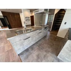 リビングが見渡せるキッチンとのことで、場所を大幅に移動させアイランドキッチンとしました。お施主様好みのグレー×ステンレスを採用し、スタイリッシュでおしゃれな空間に仕上がりました。