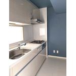 ワンポイントカラーが目立つ、おしゃれなキッチン